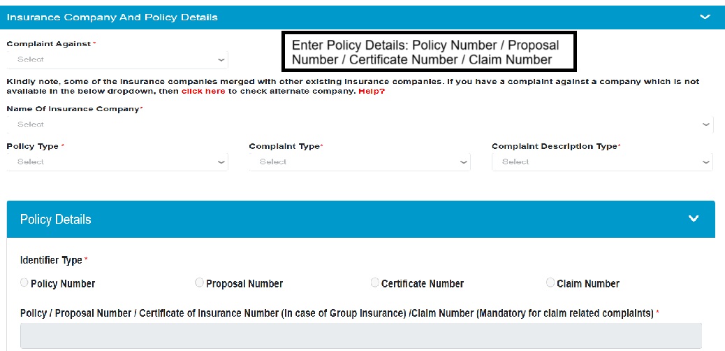 - Fill the details as per the format below on the Bima Bharosa (IRDAI) portal while registering a new complaint: