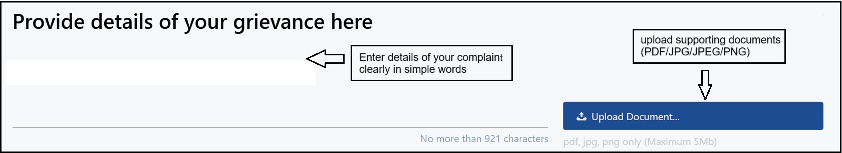 - Provide details of your complaint clearly in simple words and upload supporting documents (PDF/JPG/JPEG/PNG).