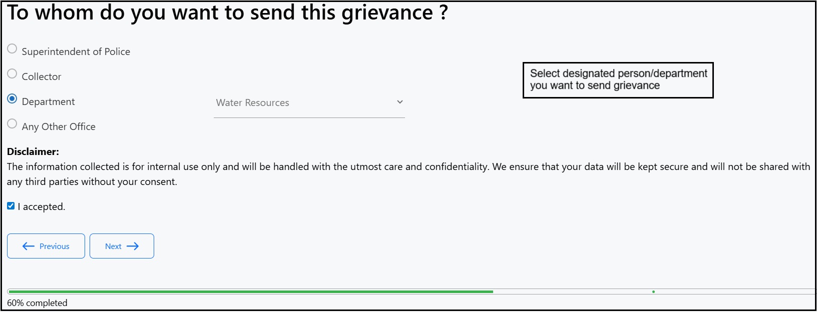 - Select designated person/department you want to send grievance .