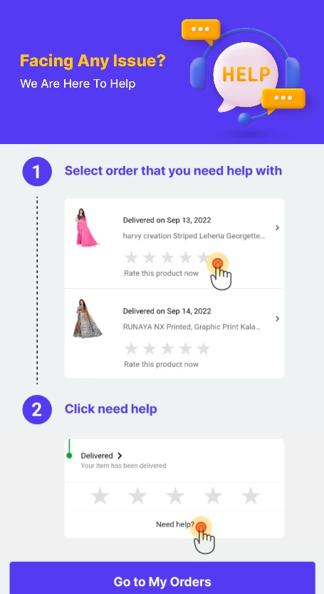 Sar maine apne App se ek Sadi ka order Lagaya Tha jismein online payment bhi kar diya but sar vah my order Mein Na dikh raha hai na so ho raha hai so please meri pareshani ko solve kiya jaaye